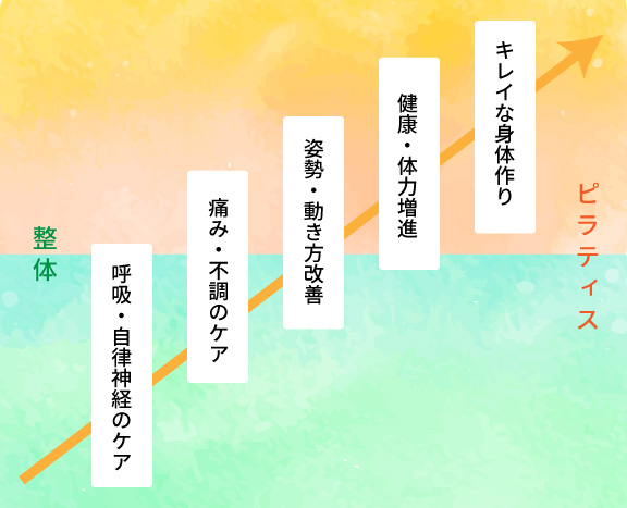 また、ピラティス&トレーニングのコースへ移行する事で整体のメンテナンスだけでは対応できない加齢による体力の低下にも対応ができます。